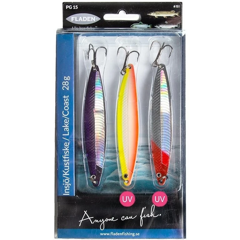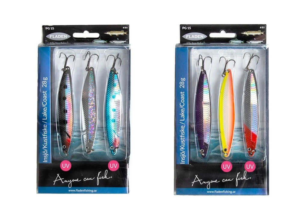 Dieses Set besteht aus drei verschiedenfarbigen Nidingen Blinkern mit einem Gewicht von 28g. Es gibt zwei verschiedene Modelle mit verschiedenen Farbvarianten.