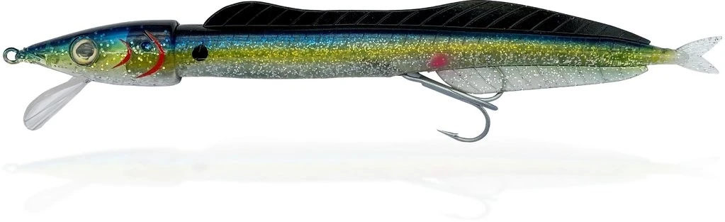 Mit dem Rhino Sandaal-Baitholder ist es möglich, sowohl Sandaale aus Gummi (im Lieferumfang enthalten) als auch entsprechende Naturköder einzusetzen. Beim Einsatz echter Sandaale wird das Haken-Rig von hinten durch die Kiemen durch das Maul geführt und in der Öse im Kopf gesichert, während der Haken an der Flanke eingestochen wird. Die Sicherung des Köders in Kopf erfolgt mit einem Zahnstocher. In der ausgelieferten „ready to fish“-Variante ist bereits ein naturgetreuer Sandaalschwanz montiert. Sein Laufverhalten ähnelt dem eines natürlichen Sandaals sehr, je nach Anströmung schwänzelt er nicht nur, sondern bricht ab und an seitlich aus – bis hin zu einer ganzen Rolle um die Längsachse. Dieses Laufverhalten scheint den Räubern sehr zu gefallen, denn unzählige Fische wurden schon in der Testphase überlistet. Die Attacken waren teilweise so hart, dass vom System nur noch der Kopf aus dem Maul herausschaute. Ideal einzusetzen bei Geschwindigkeiten zwischen 1,5 und 2,5 Knoten. Die Ersatzschwänze sind auch einzeln zu erhalten. Der Köder ist 20cm lang und 25g schwer.